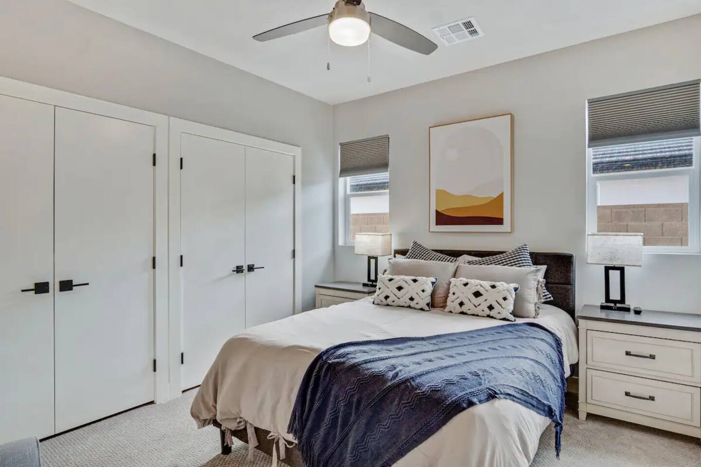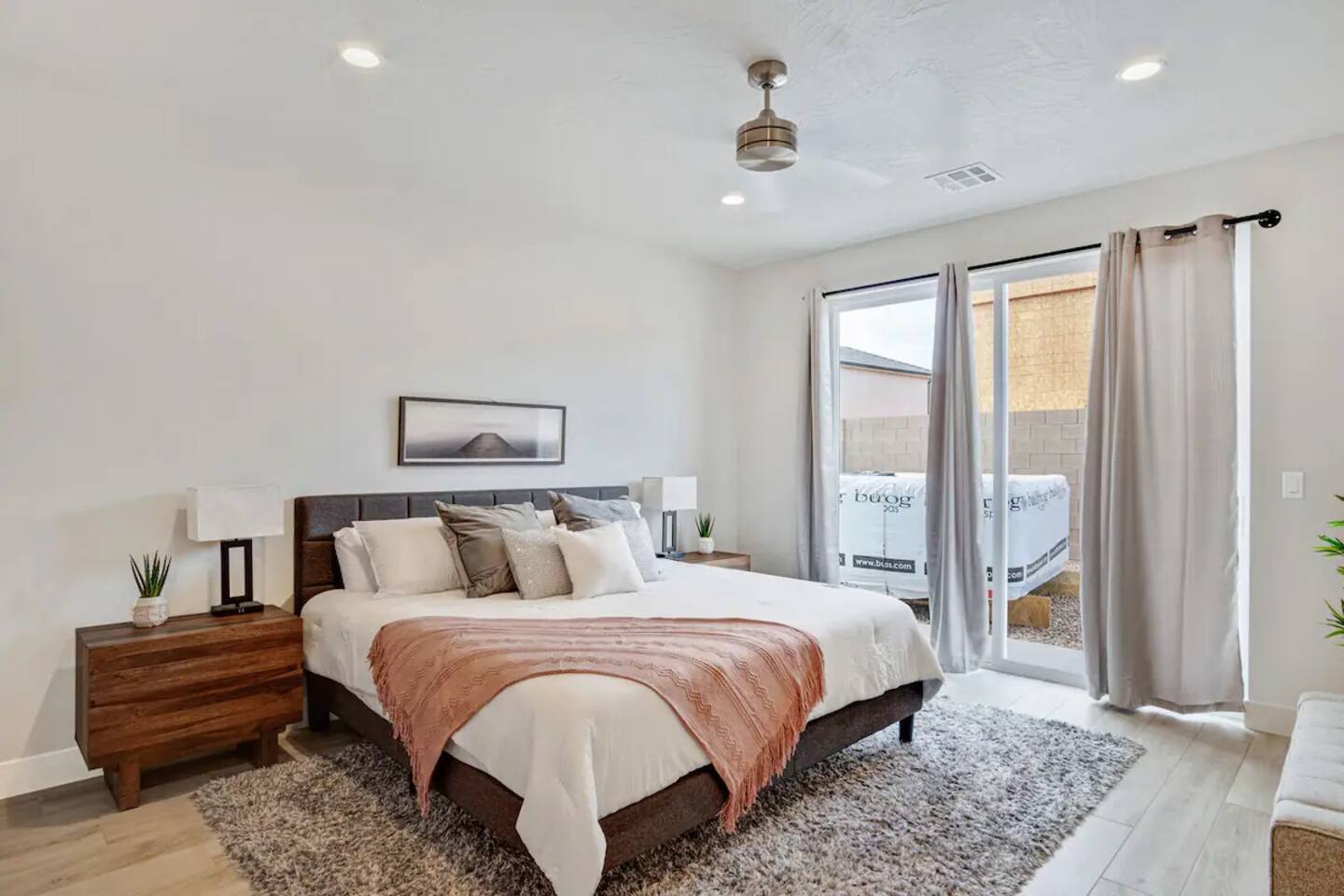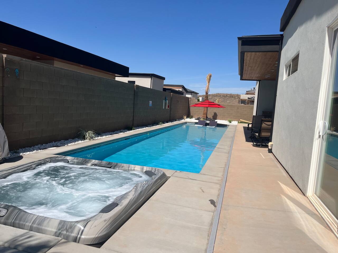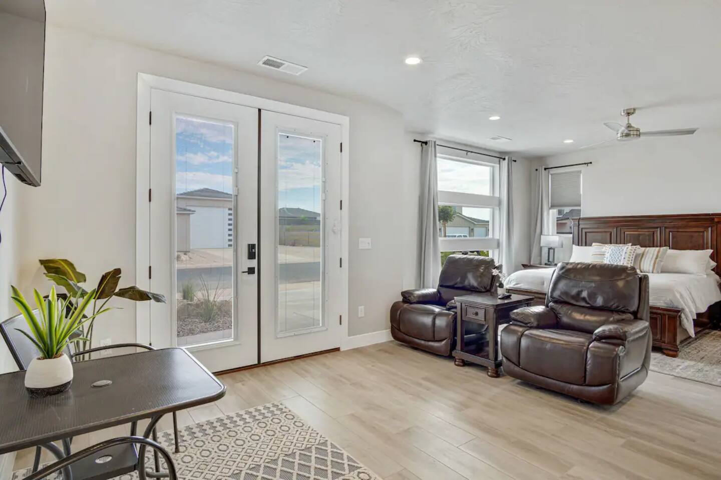 The space Whether your a group of golfers looking to enjoy Sand Hollow Golf course or a family or group looking for spacious accommodations look no further this is your home away from home. Your group will enjoy the private hot tub and pool, and open spacious accommodations. Minutes from adventure! The master bedroom has a king bed with a large 75 inch TV. With a door that walks out to your private hot tub. The master bedroom offers a private en-suite bathroom, and a double head walk-in shower and separated Tub with dual sinks and walk in closet. The second bedroom, offers a Queen bed with lots of closet space. Bedrooms 3 has a Queen bed and 55 inch TV private with a en-suite bath. The fourth bedroom is in the connected casita. This can be accessed within the home or its own private door outside. There is a large 55 inch TV, washer and dryer, full kitchen, ensuite bath and a King bed! In the main area there is a large sectional with USB charging throughout the couch. Large Smart TV, and open floor plan. The spacious kitchen has everything you need to cook with. With a laundry room off the kitchen. In total there are 2 sets of washer and dryers within the unit! Located in Pecan Valley Resort in Hurricane City, just off I-15, this resort is convenient off SR9, grocery shopping, movie theaters, golfing, Sand Hollow Reservoir and only 40 minutes away from Zion National Park! Want to experience some theatrics? No problem! With easy freeway access, Tuacahn Outdoor Amphitheater is just a short drive away! Relax in the quiet of the mountains without sacrificing quick city life access! The garage is not for guest use, guests may park in the driveway which has 4 regular length spaces and one extra long space. Come and explore this awesome new location in the St George area! Bedrooms: Master Bedroom: King Bed and Private Bathroom Second Bedroom: Queen Suite, Bathroom across the hall. Third Bedroom: Queen bed with Private Bathroom Fourth Bedroom: In Casita, offers a King Bed with Private Bathroom 4 Full Bathrooms Granite Countertops Stainless Steel Appliances Custom Cabinetry Coffee Maker Toaster Blender Electric Hand Mixer Mixing Bowls Dining Table - Seats (8) Kitchen Island - Seats (5) Outdoor Chairs - Seats (4) BBQ Grill Outside Main Level Living Room: Large TV Large Sectional Couch Extras: Two sets of Washer/ Dryer Unit - Laundry detergent provided. Iron & Ironing Board Extra Towels & Linens Broom + Dust Pan Mop Vacuum
